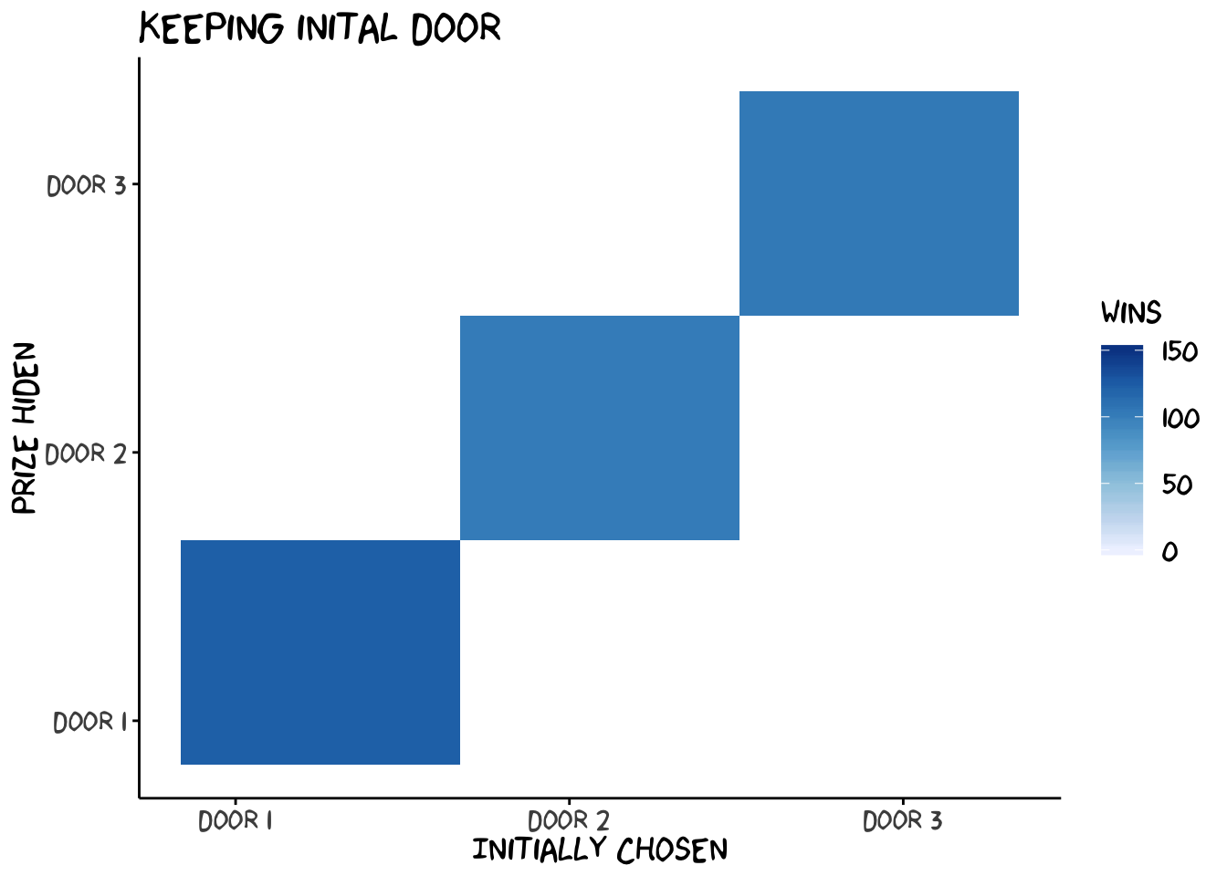 We can visualize the outcome by plotting when and how often each strategy leads to winning the prize.
