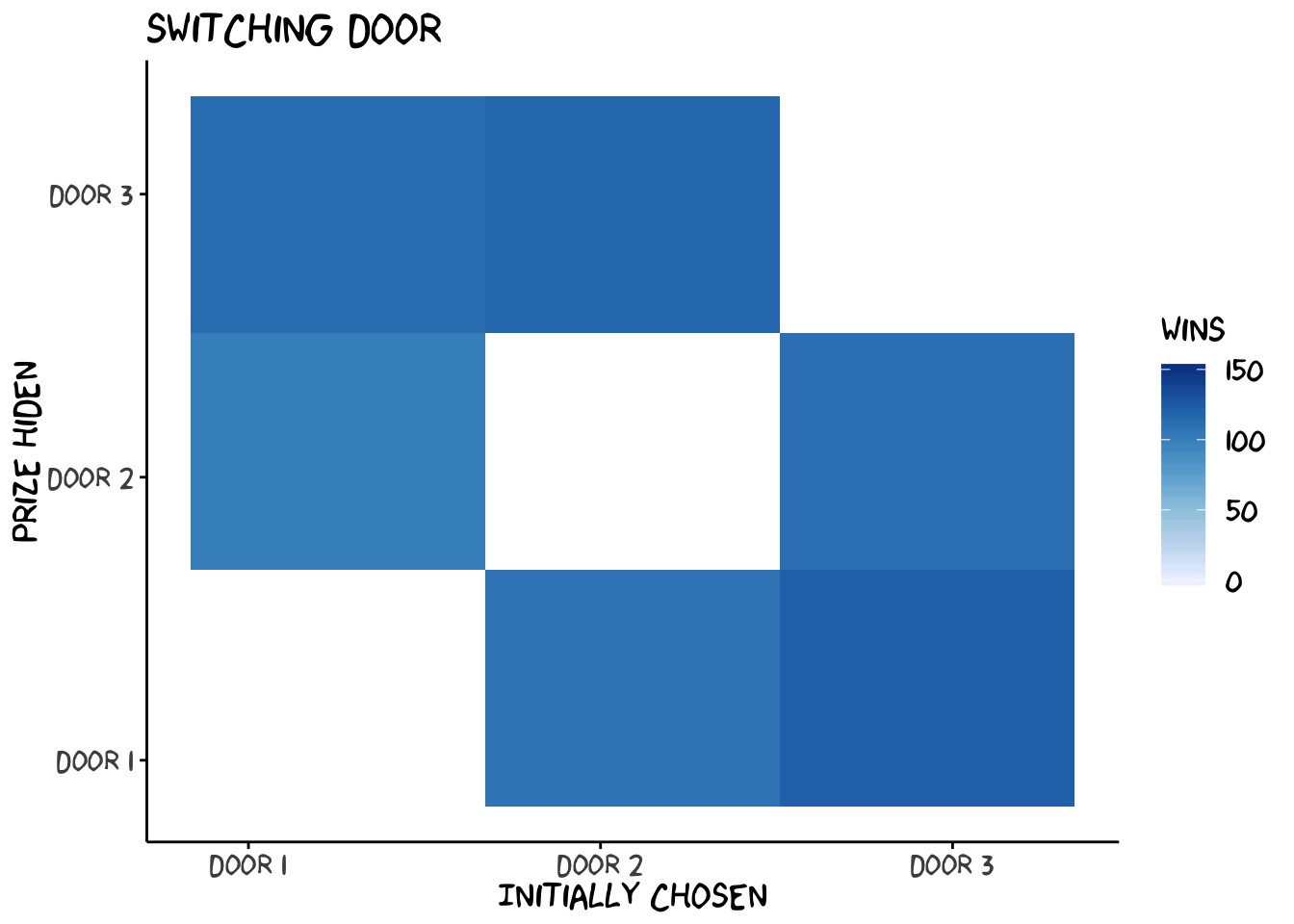 We see two interesting things in this figures: (1) "switch" wins exactly when "stay" doesn't win and (2) switching always wins if you chose the wrong door initially. Thus, staying wins with a probability of 1/3 (choosing the right door out of 3), and switching wins with a probability of 2/3. Exactly as we have calcualted with our decision tree.